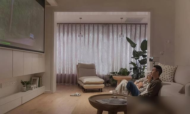 现在年轻人纠结要不要豪华背景墙,这套房直接省了,用幕布代替电视,客厅腾出大片空地。